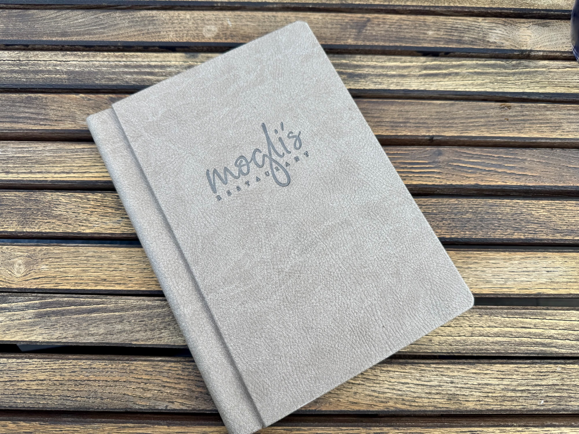 Die hochwertige Speisekarte in edlem Grau liegt auf einem rustikalen Holztisch und trägt das stilvolle Logo des mogli’s. Die Nahaufnahme unterstreicht die Liebe zum Detail und spiegelt die moderne und zugleich bodenständige Atmosphäre des Restaurants wider.