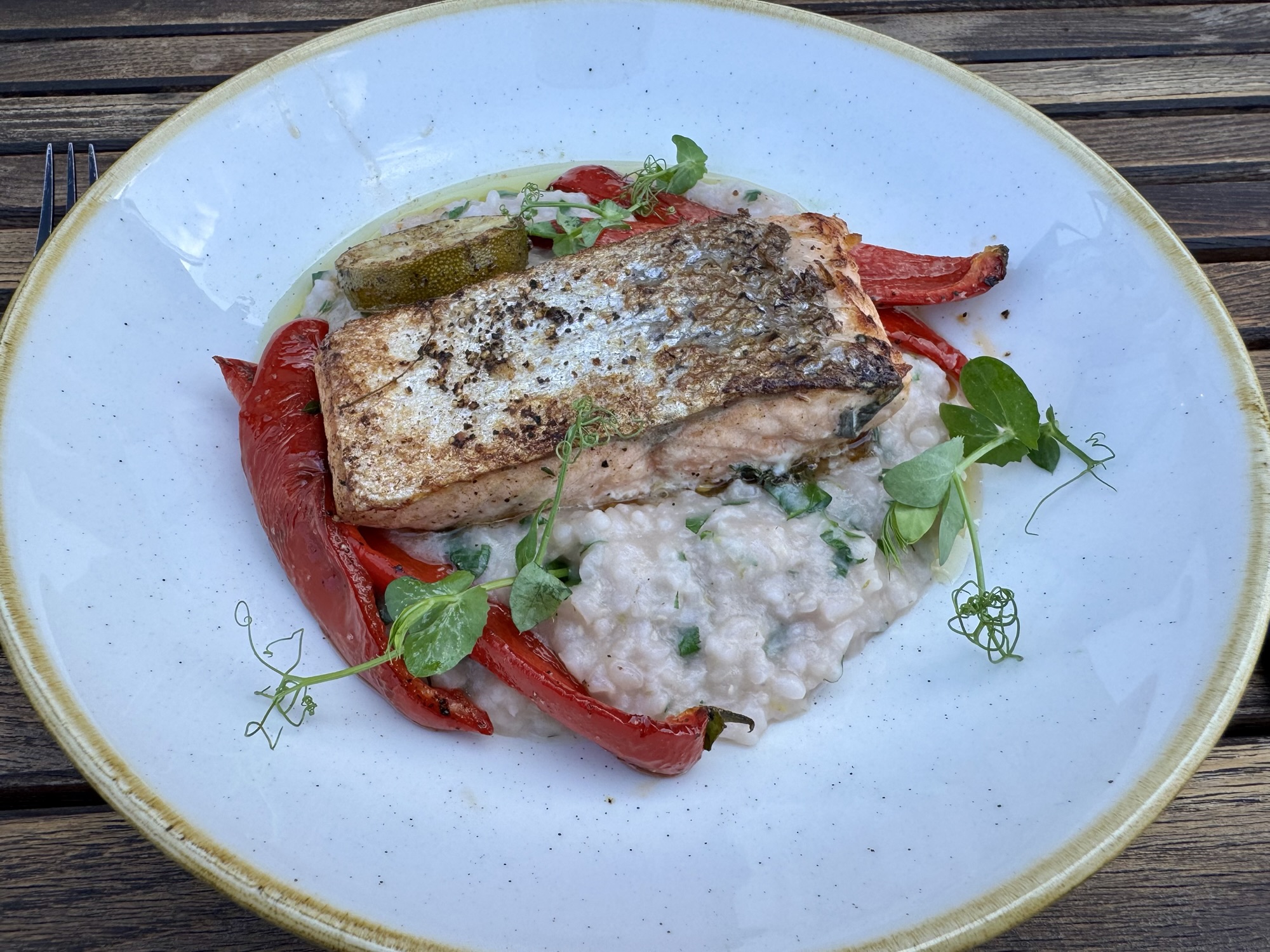 Gebratener Lachs mit Haut serviert auf mit Kräutern verfeinertem Risotto, einem Stück Limette und gegrillter Spitzpaprika. Auf dem Teller liegen außerdem ein paar grüne Sprossen.